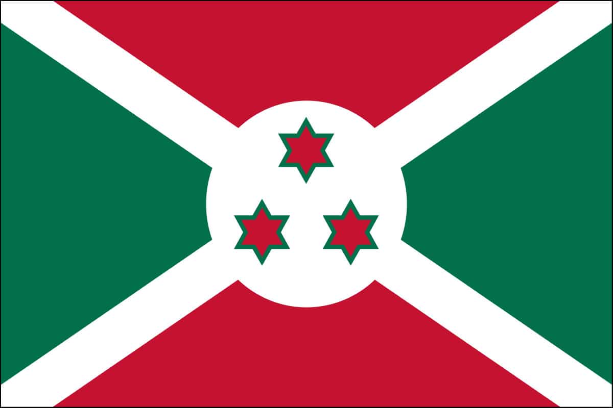 BURUNDI ? The Burundi flag was adopted in 1957. It consists of a white St. Andrews Cross dividing the banner into four triangles; red triangles at the top and bottom, and green triangles at the left and the right. At the center of the cross is a white circle containing three red six point stars ? each of which is bordered in green. These three stars refer to the words in the national motto “Unit?, Travail, Progr?s” (French for “Unity, Work, Progress”).