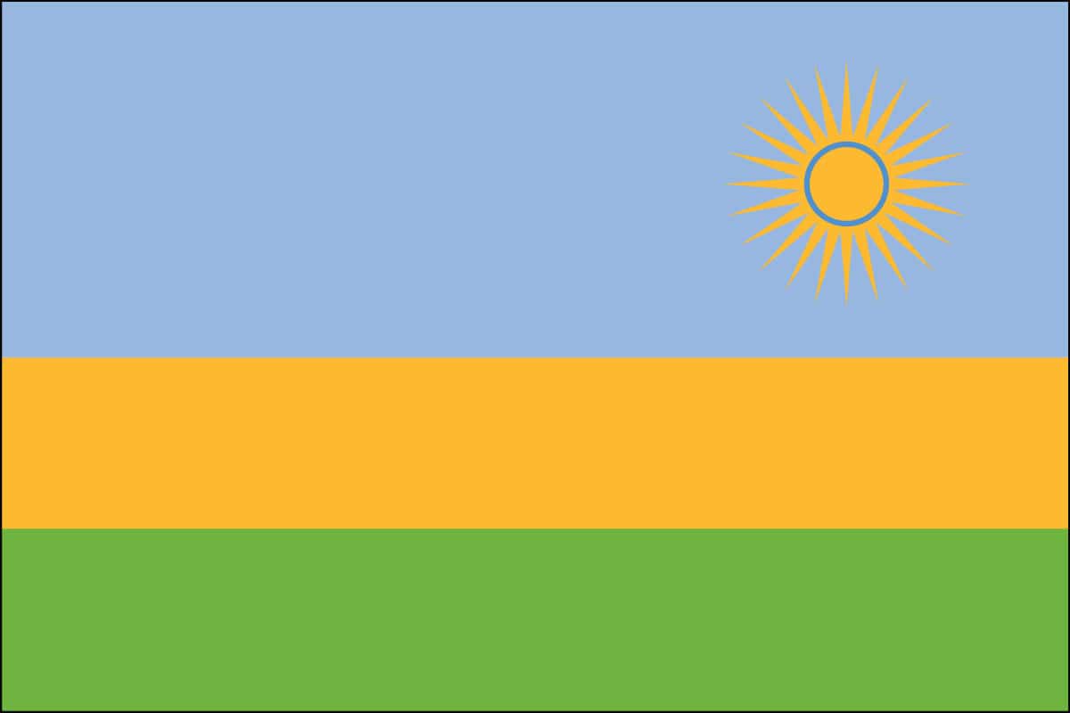 Rwanda Flag. 100% Nylon. Made in USA to Official Design Specifications. Proven to last the longest and be the brightest. Durable 200-denier nylon fabric flies in the lightest breeze and blocks damaging UV rays. Finished with sturdy canvas heading and strong brass grommets.